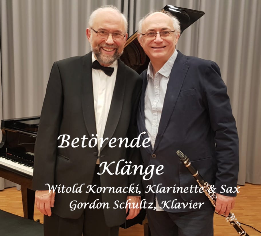 Zwei konzerterprobte Musiker vereinen die vielfältigen Klänge ihrer Instrumente und geben eine wunderschöne Auswahl aus der Klassik, der Film- und Klezmer Musik, sowie Jazz Evergreens zum Besten. Witold Kornacki, Klarinette und Saxophone, betört das Publikum mit seinem Spiel.
